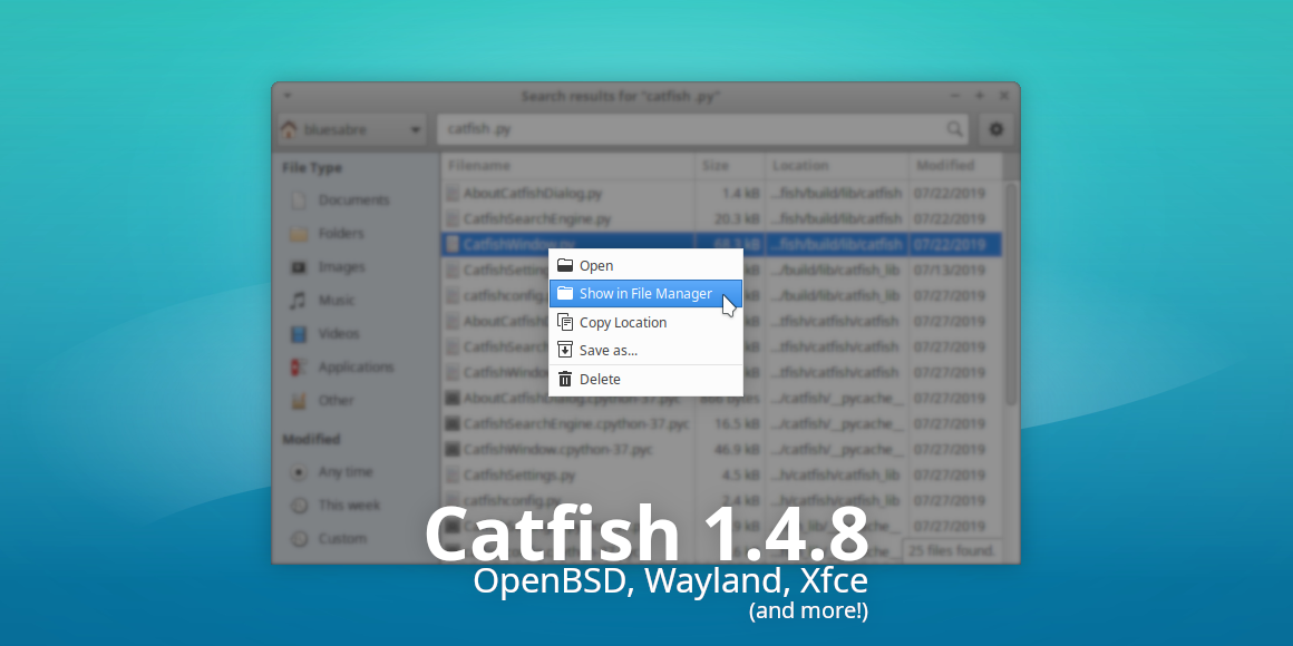 Catfish 1.4.8 is now available. This latest release improves integration with OpenBSD, Wayland, Xfce, and numerous other desktop configurations. It also features many translation updates to improve Catfish’s international support.